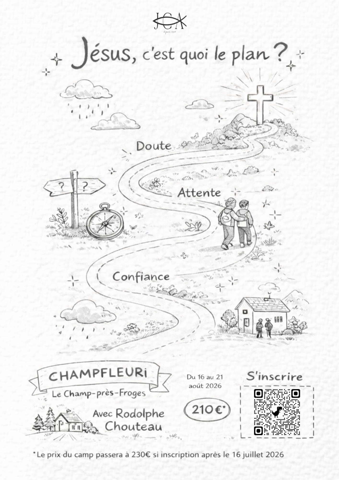 Tu veux vivre une semaine à part ? Une semaine pour rencontrer Dieu, faire des rencontres inoubliables, te ressourcer et t’amuser dans une ambiance de feu ? Alors le Camp de Jeunes JCA 2026 est fait pour toi !